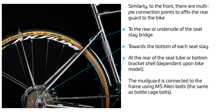 Whichever model you own will directly affect how the rear mudguard attaches to the frame. The graphic below illustrates how some frames feature a bridge between the seat stays and some won't. The frame material and how much tyre clearance it offers are the determining factors in whether there is a built-in bridge or not. Alloy and titanium frames will typically include one, but carbon won't.