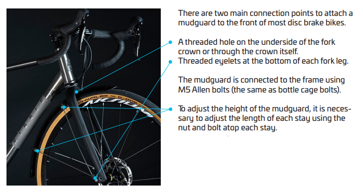 This graphic demonstrates the various mounting points for attaching a front mudguard to any of our current frameset models.